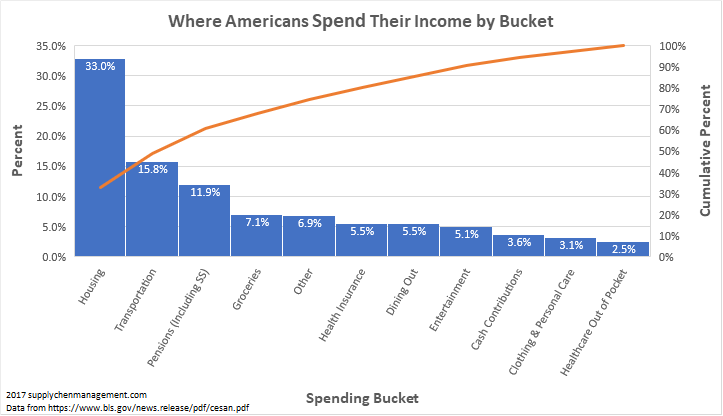 Enter The Pareto Principle, otherwise known as the 80/20 rule.  It advises to focus on the 20% of causes (actions) that will generate 80% of the effects (results).  Even though the ratio will vary, the ideology stays the same: focus on the few things that will generate the big wins.  There are two sides to the equation: Income and Expenses.  According to the 2016 Consumer Expenditure data from the Bureau of Labor Statistics, average expenditures were $57,311 per unit. [2]